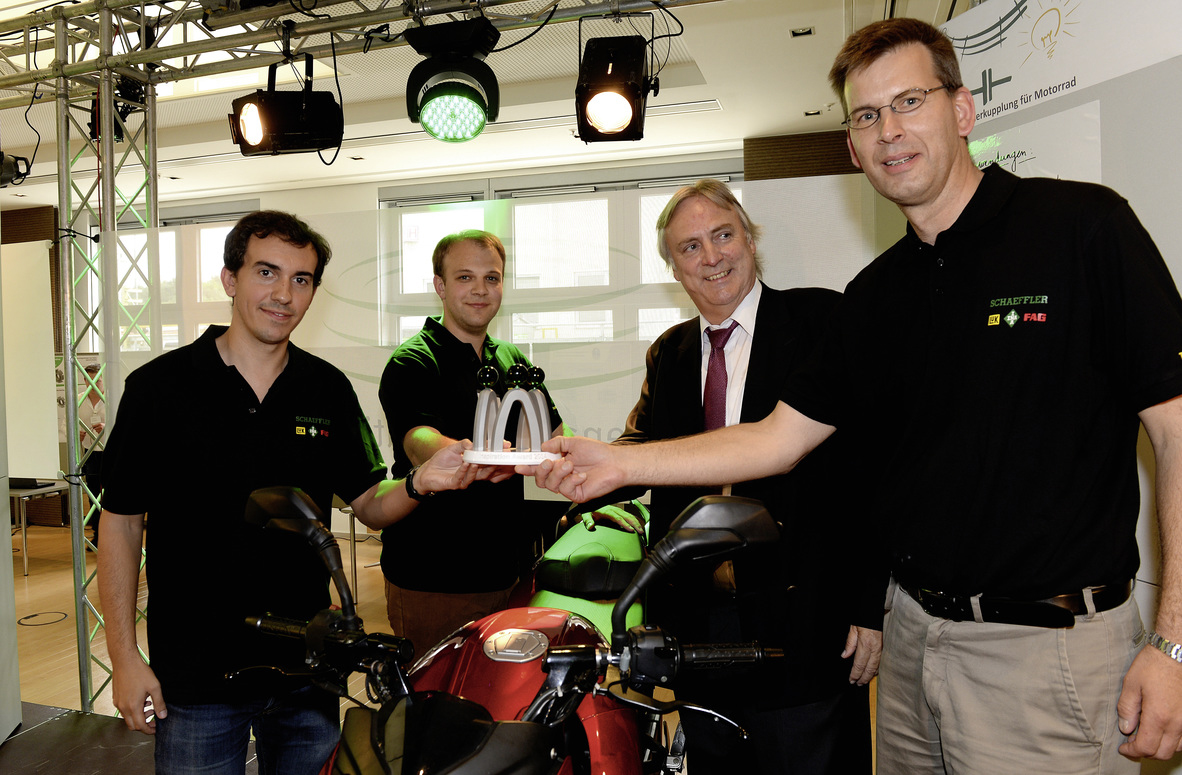 從左至右:來(lái)自布爾的馬丁查姆布倫(MartinChambrion)和詹斯蘭格齊(JensLanganki)憑借關(guān)于摩托車新離合器的創(chuàng)意獲得了今年的靈感大獎(jiǎng)。舍弗勒集團(tuán)副首席執(zhí)行官兼首席技術(shù)官彼得古茲默教授和離合器壓盤產(chǎn)品開(kāi)發(fā)總監(jiān)克里斯托弗惠特曼為其頒獎(jiǎng)。